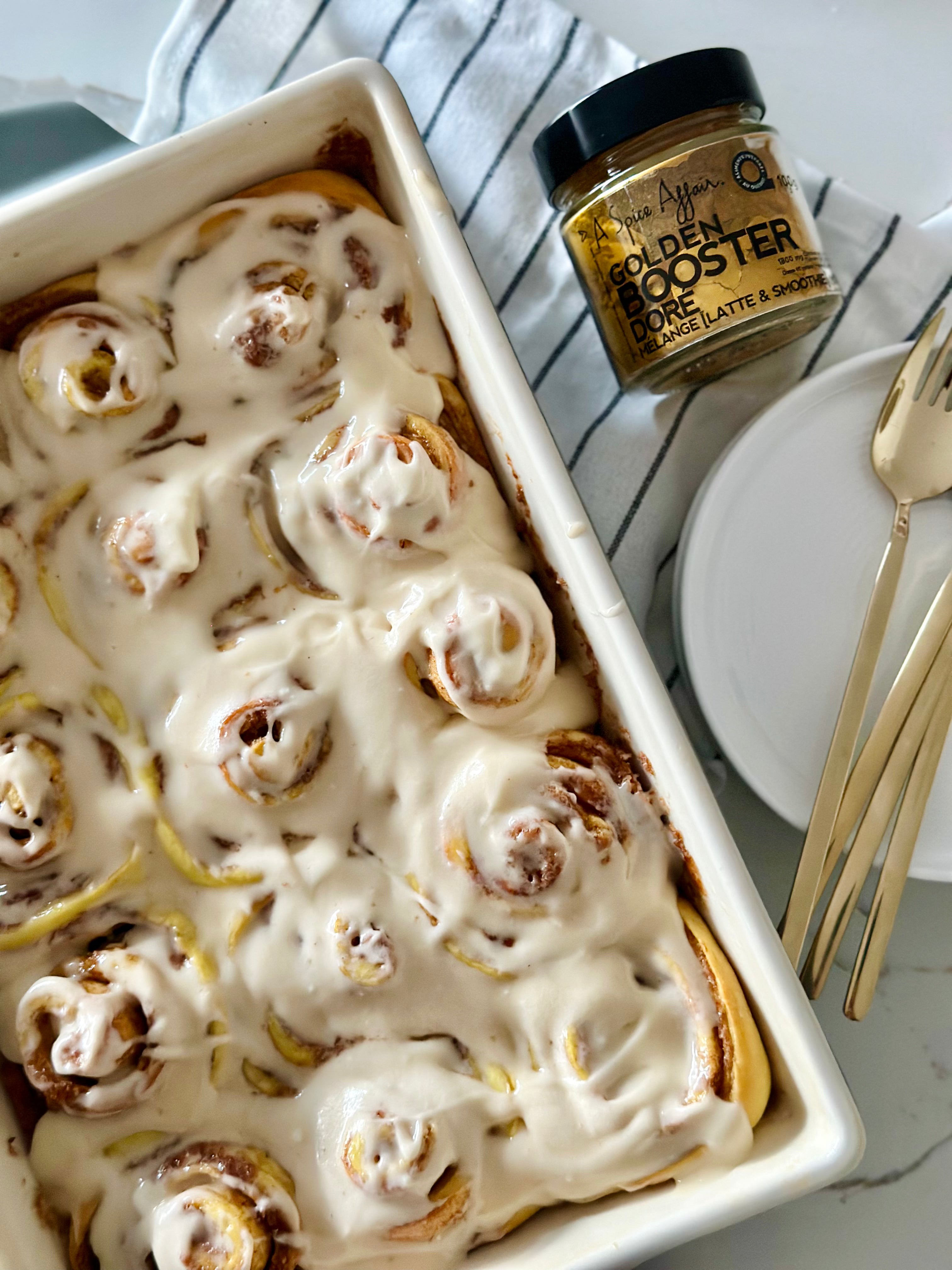 Supercharged cinnamon rolls with our Golden Booster Latte & Smoothie mix 🥰 Packed with Turmeric, Ginger, Cinnamon, Black Pepper, Cloves & Cardamom for the most comforting weekend treat. Every bite is pure comfort!