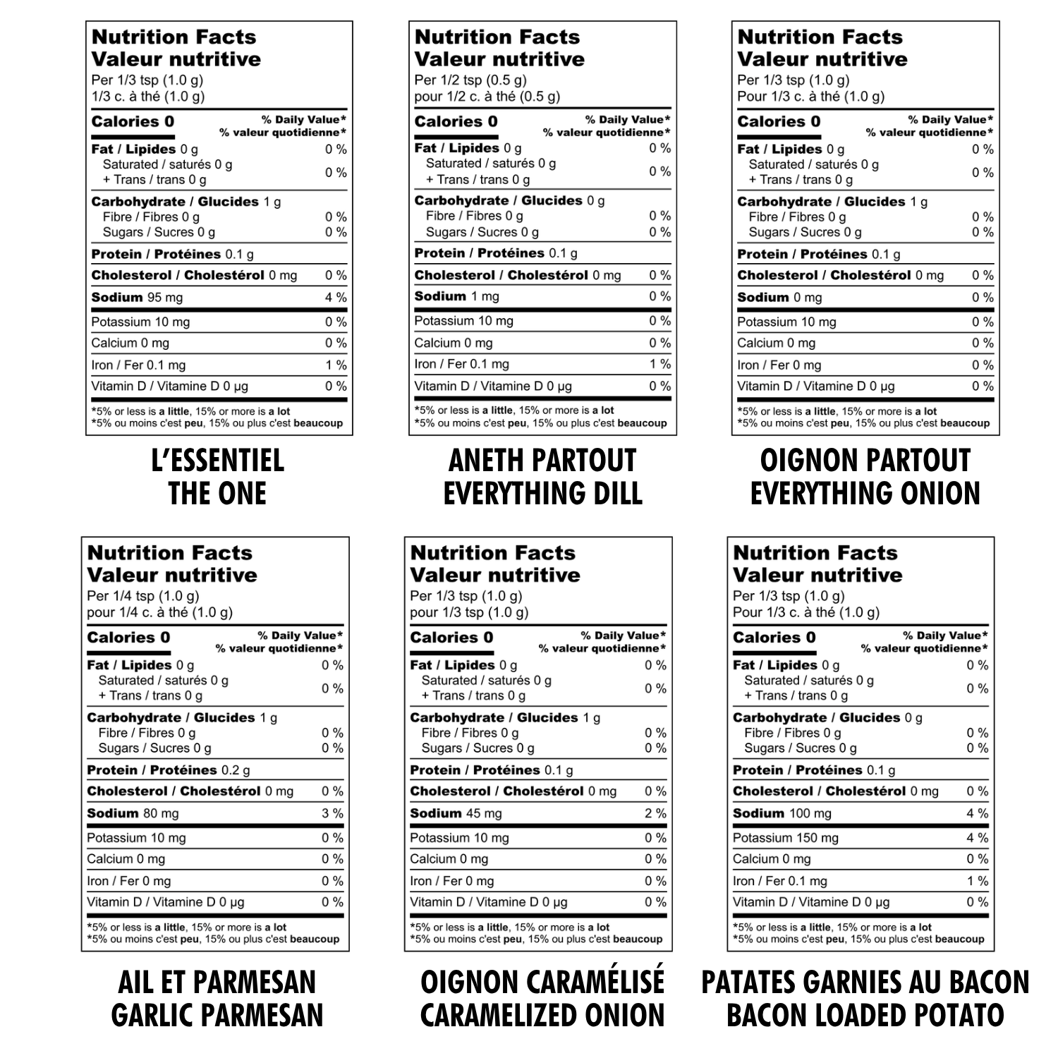Nutritional yeast (Natural flavor), Garlic, Sea salt (21%), Black pepper, Onion, Paprika, Natural flavour, Torula yeast, Yeast extract, Parsley, Extra virgin olive oil.